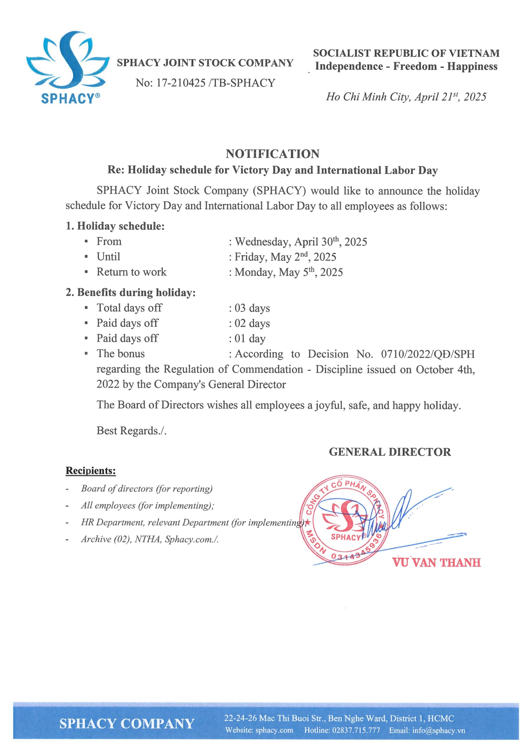 HomeNews HOLIDAY SCHEDULE ON VICTORY DAY AND INTERNATIONAL LABOR DAY 2025